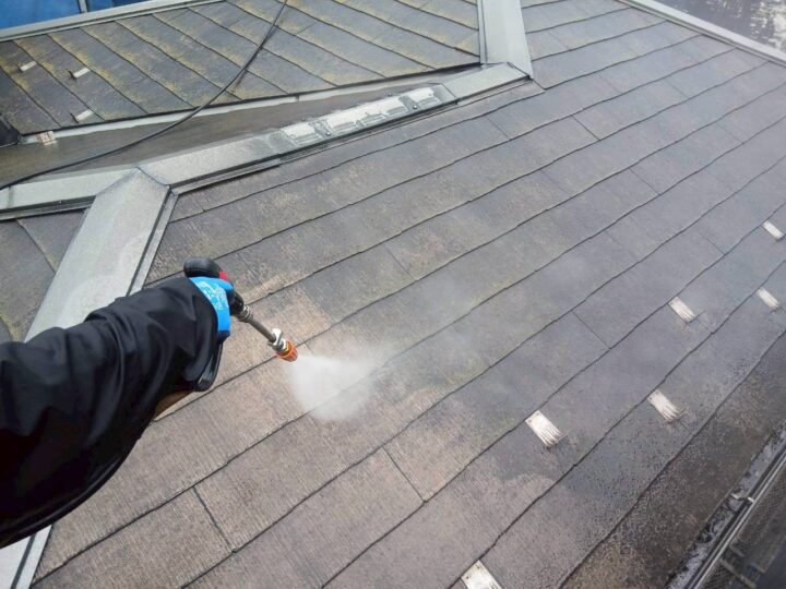 流山市T様邸ですが本日は、屋根上塗り工事を行いました🙂 屋根の上塗りを行います(水谷ペイント・ナノル-フ10) 屋根の塗装が完了しました。明日は外壁の塗装を行います🙆♂️