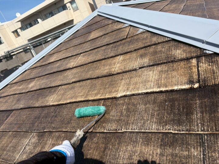 流山市W様邸ですが本日は、屋根の下塗りを行いました✌ 屋根の下塗りを行います(KFケミカル・KFマイルドシ-ラ-) 下地の状態が悪いためもう一度下塗りを行います 明日は屋根の中塗りを行います🙋♂️