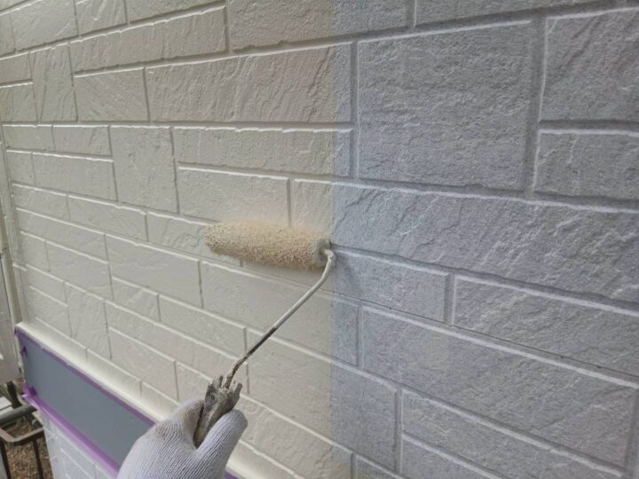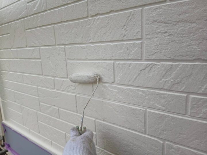 流山市Y様邸ですが本日は、アクセント外壁の中塗り・上塗りを行いました😉 アクセント外壁の中塗りを行います(SK化研・エスケ-プレミアム無機) アクセント外壁の上塗りを行います(SK化研・エスケ-プレミアム無機) 外壁塗装が完了いたしました。明日より付帯部塗装を行います☺