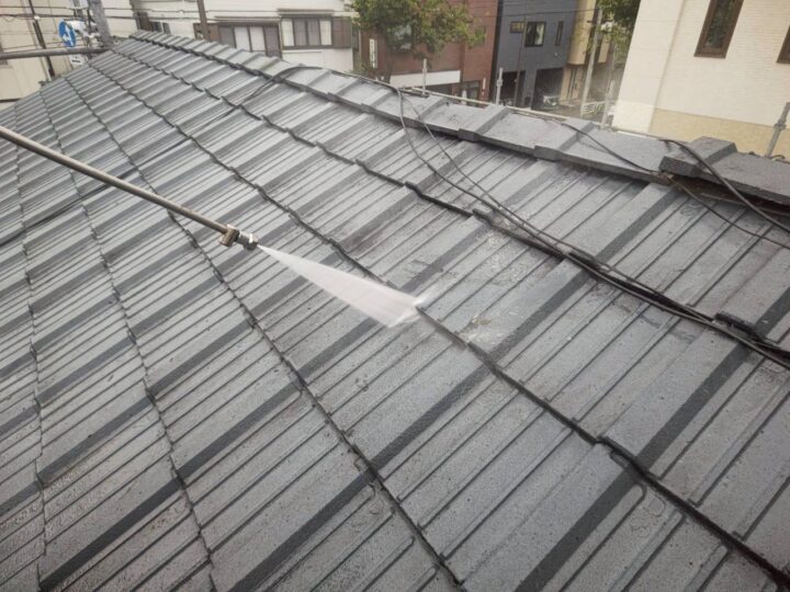 柏市T様邸ですが本日は、屋根の高圧洗浄を行いました☔ 建物平屋部分のセメント瓦屋根の塗装工事を行いますので高圧洗浄を行いました🙋♂️ セメント瓦屋根の高圧洗浄を行います 屋根を乾燥させるため明日はお休みして明後日から作業を行います👌