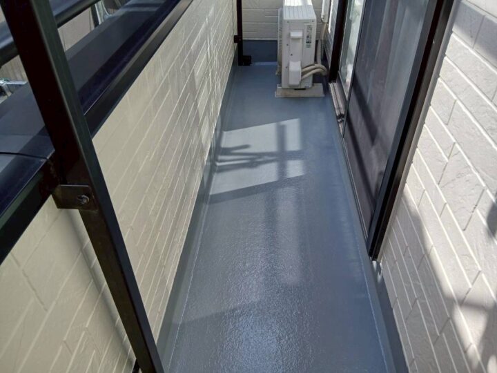 流山市H様邸ですが本日は、ベランダ床塗装を行いました😀 ベランダ床下塗りを行います(東日本塗料・FRPプライマ-) ベランダ床上塗りを行います(東日本塗料・弾性トップ14) 完了全景になります✨ 明日より屋根板金工事を行います😄