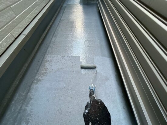 ベランダ床の上塗りを行います(東日本塗料・弾性トップ14)